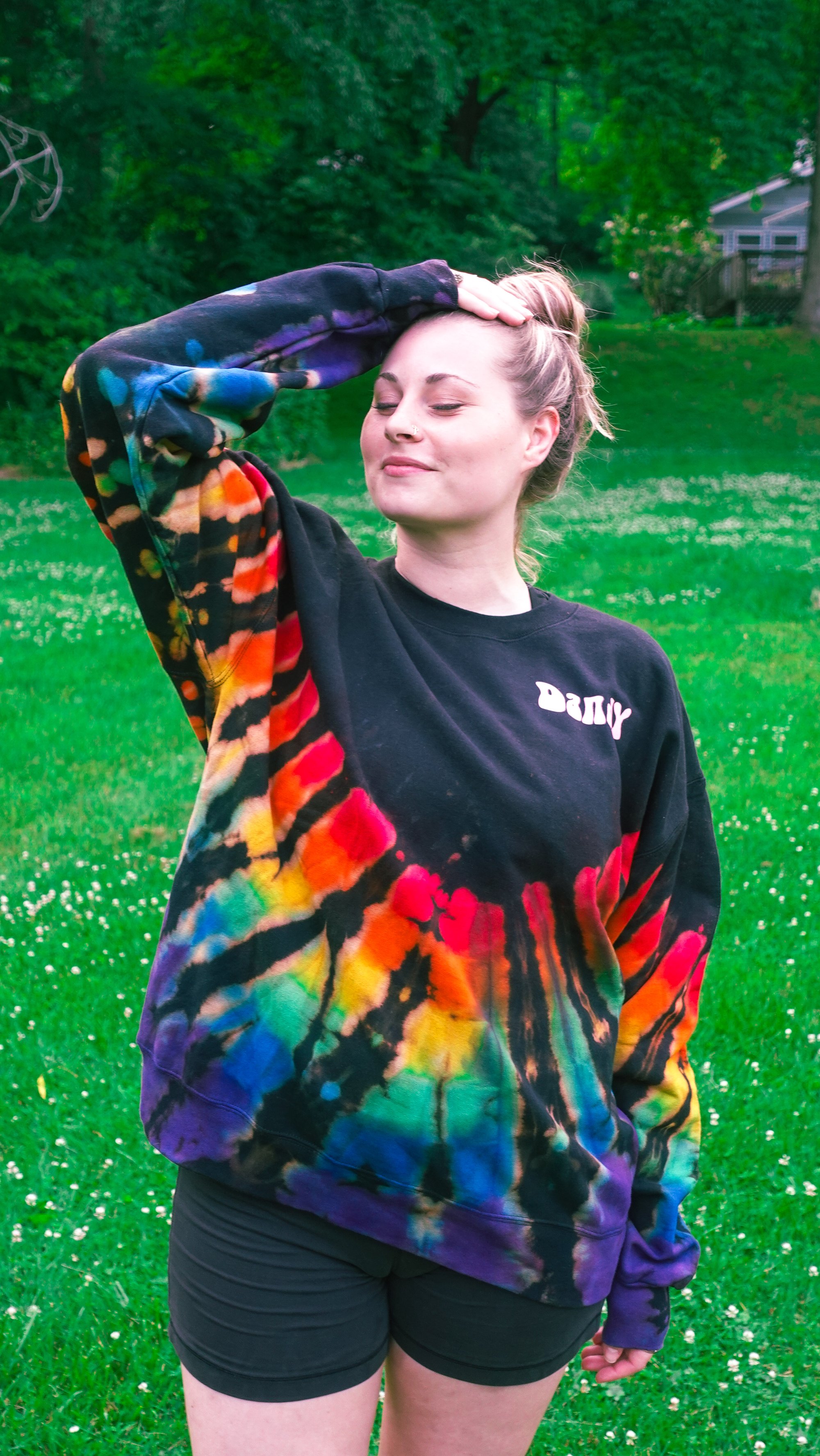 Black crewneck sweatshirt with coral Dandy font. Rainbow Tie-dyed in "V" pattern on lower half. ( Each one is hand dyed. Exact colors an patterns will vary)